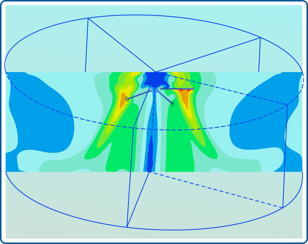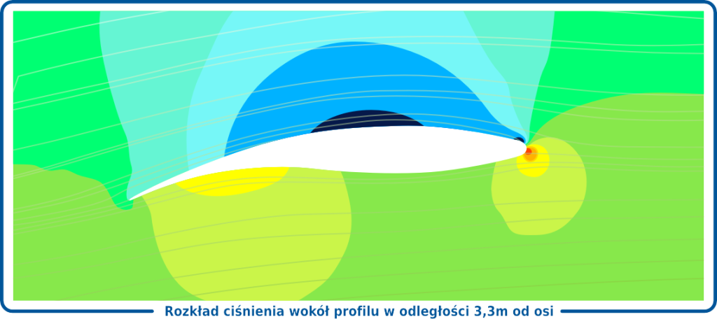 Na rysunku przedstawiono rozkład ciśnienia wokół profilu wentylatora. Niebieska strefa na środku górnej powierzchni profilu świadczy o prawidłowym zlokalizowaniu podciśnienia (na całej powierzchni górnej), natomiast żółta strefa na dolnej części o miejscu wystąpienia nadciśnienia.